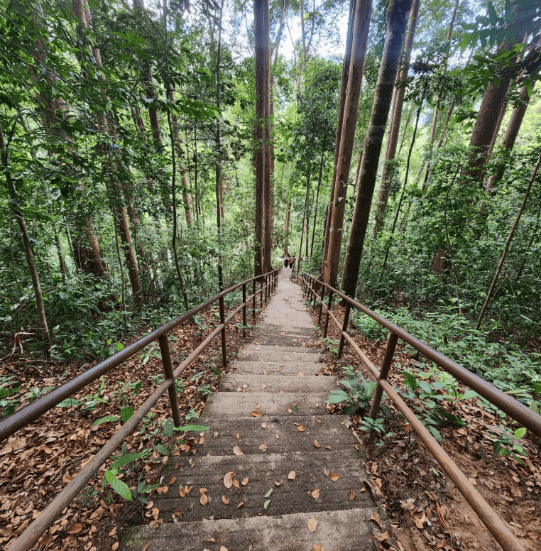The hike passes through the iconic Kanching Waterfall, where multiple waterfall tiers unfold along the route. Lower sections feature well-structured steps, gradually giving way to more rugged jungle terrain as the trail ascends. Along the way, hikers can enjoy scenic viewpoints, lush dipterocarp forest, and occasional wildlife sightings.