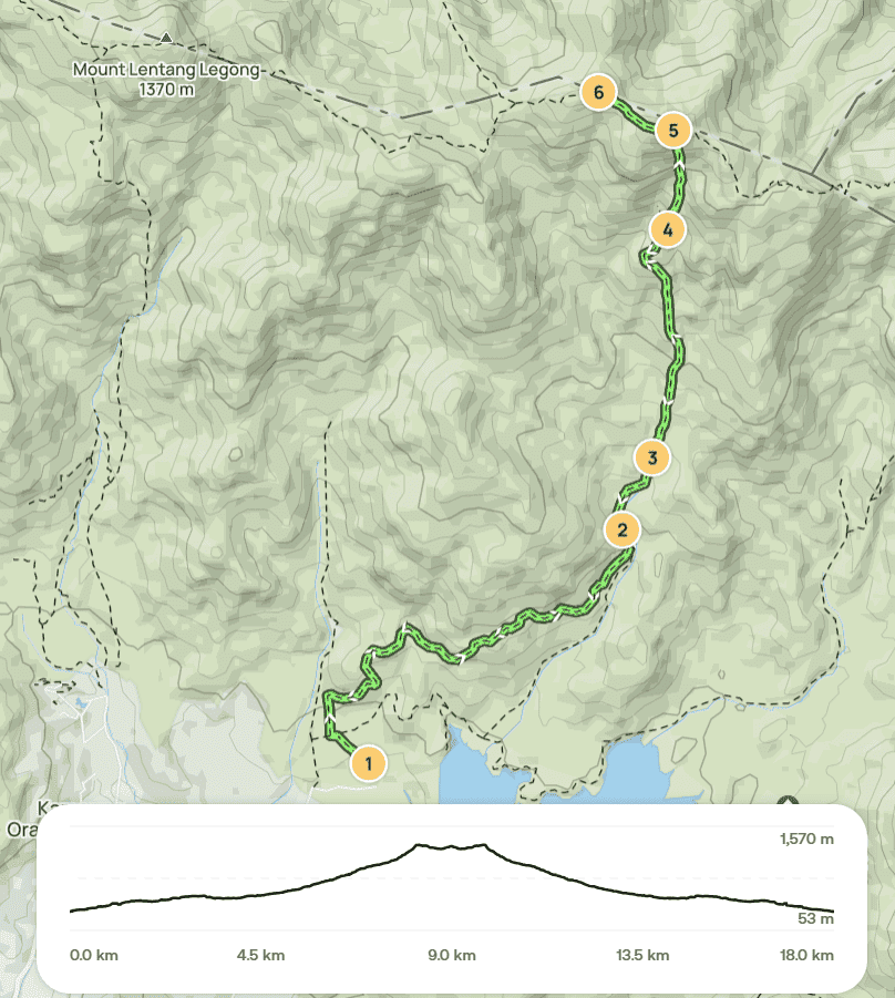 The trek is an enduring test of will and stamina, covering a grueling 19 km round trip. It starts with a long, undulating "never-ending road" before entering the dense forest. Along the way, hikers will pass through a series of key landmarks in order: Taman Eko Rimba, Kem Lolo, Kem Pacat, Puncak Pengasih, and finally, the Nuang Peak. The path becomes progressively steeper, with several river crossings that can be especially tricky after heavy rain. The final push to the summit is a punishing ascent that has earned the mountain its reputation as a benchmark for fitness.